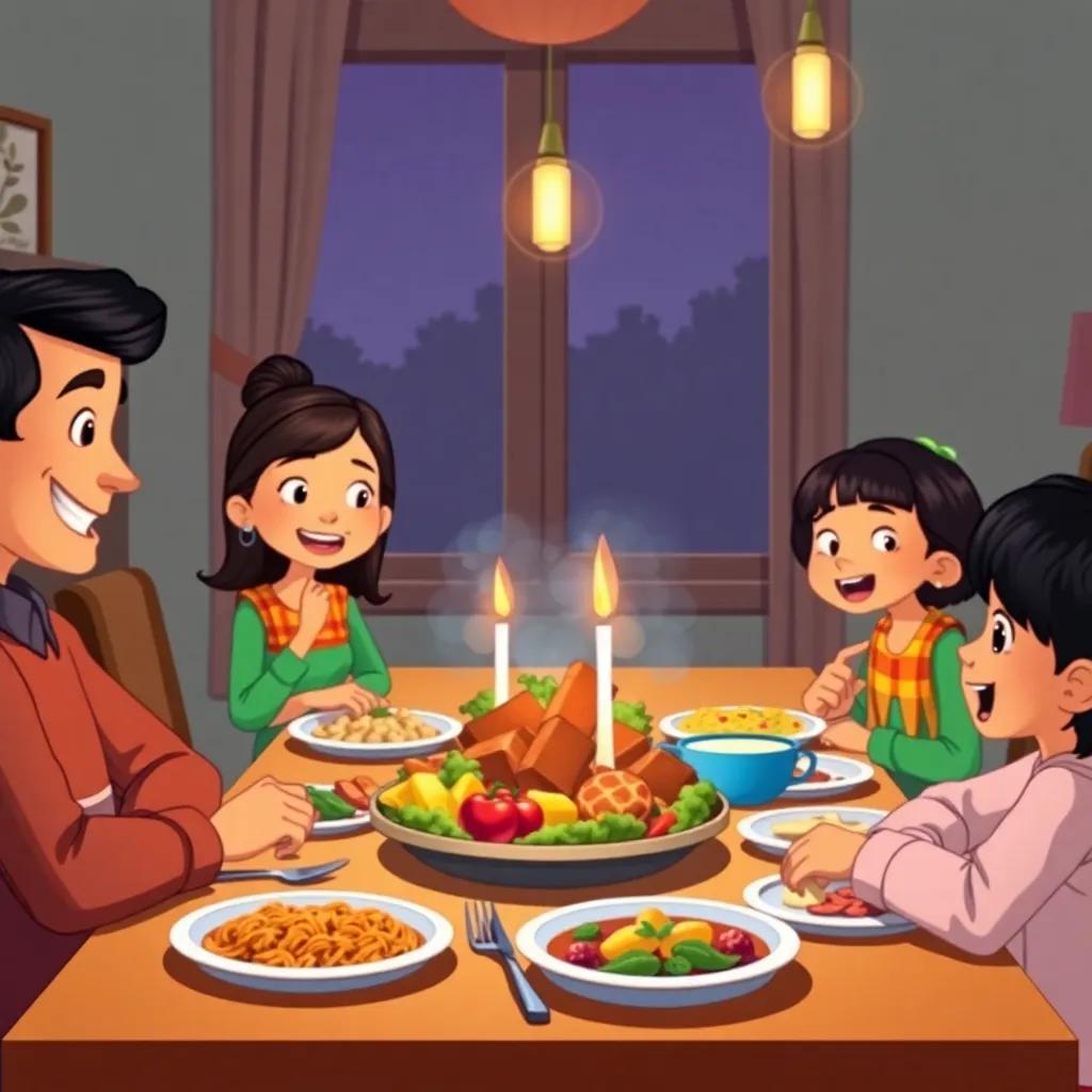 A family gathered around a dinner table, sharing a delicious meal, smiles and warmth filling the room, cozy evening setting, heartwarming, vibrant colors
