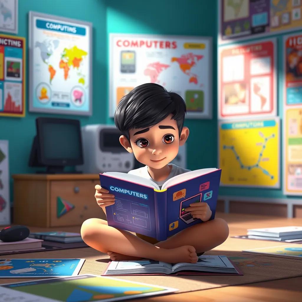 Ali, a young Arab boy with short black hair, reading a book about computers, sitting cross-legged on the floor with colorful posters around, engaging and educational scene, bright and vibrant, child-friendly lighting, clear details