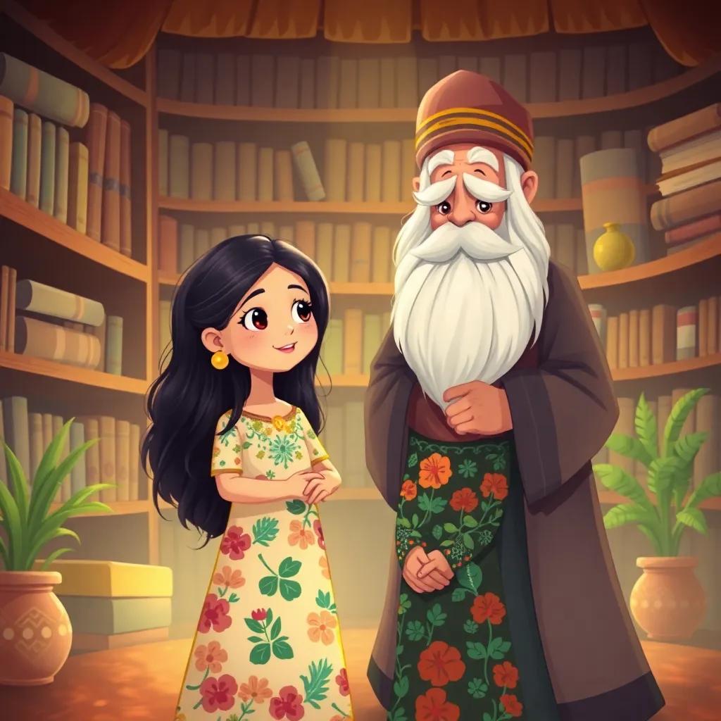 Zahra, a young Arab girl, with long dark hair in a bright floral dress, standing in front of a wise elder man, Seyed Ali, who has a long white beard and wears traditional clothing, surrounded by shelves of ancient books and herbs, warm light, friendly atmosphere, digital illustration, high quality
