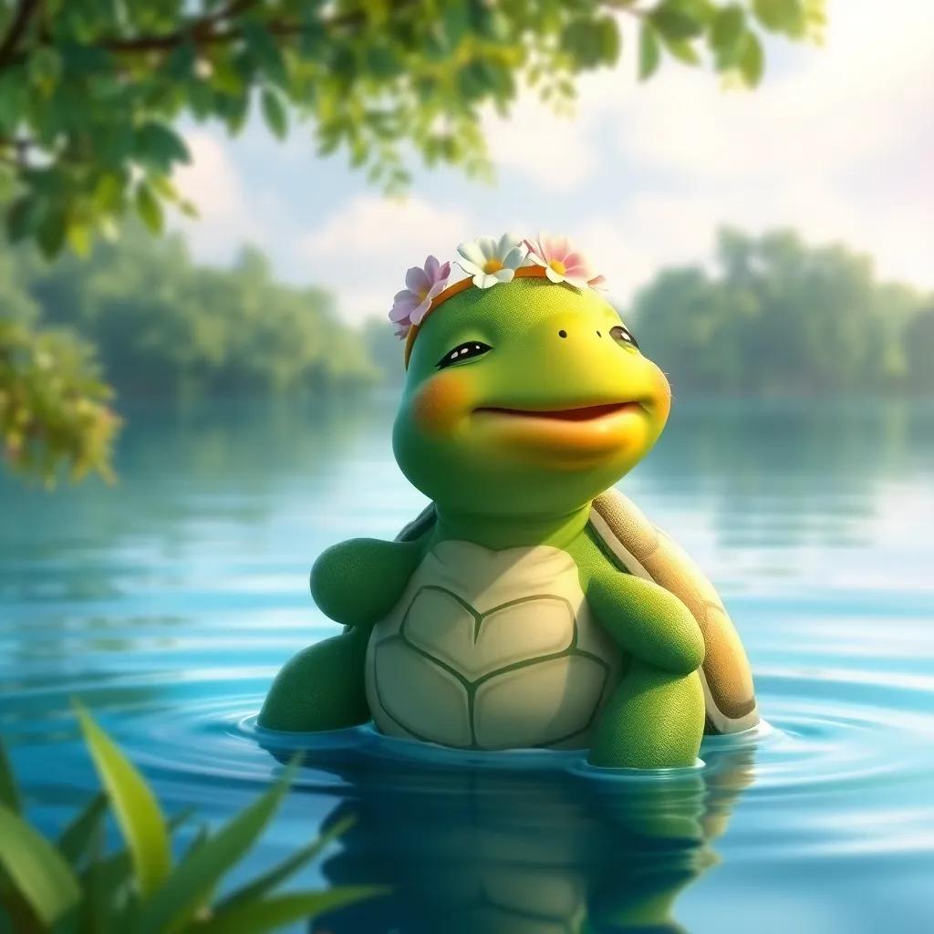 في يوم من الأيام، كانت هناك سلحفاة خضراء جميلة تعيش في بحيرة هادئة. كانت السلحفاة تحب أن تغني، وغنت بصوتها الجميل: "دندنة دندنة، المياه تلمع في الشمس!". بينما كانت تغني، جاءت بطتان حكيمتان وجميلتان، قالت إحداهما: "جميع الطيور يغنون، لكن السلحفاة تغني بأجمل الألحان!". ردت الثانية: "أحب صوتك، لكن ماذا عن مغامرة جديدة؟ لنذهب إلى الجبل!".