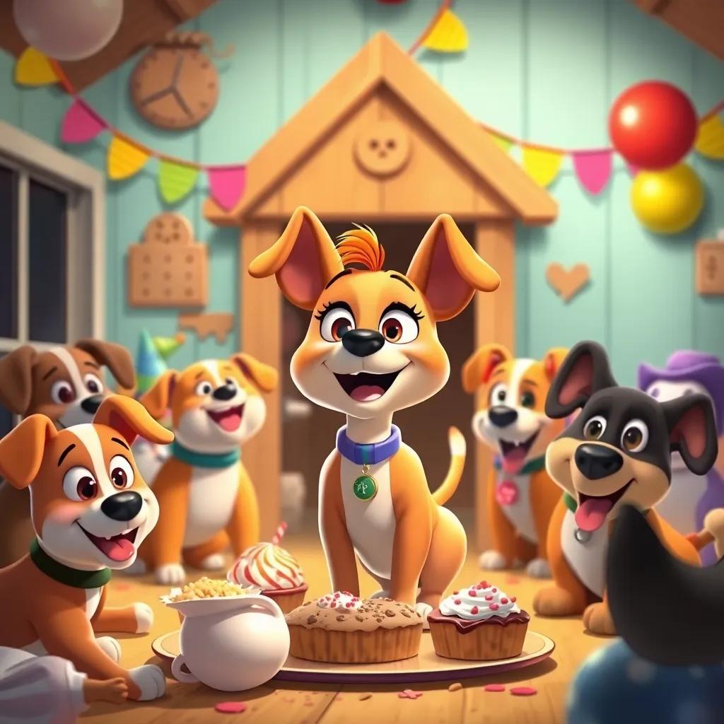 Lila, surrounded by friends at the kennel, celebrating together with tail wags and barks, colorful and cheerful setting