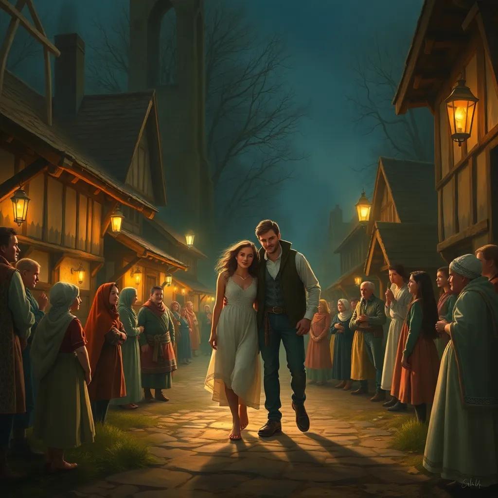 Lily and Ben stepping outside into cool night air, with villagers gathering around them in relief, warm lights and colors creating a sense of community and safety, high quality