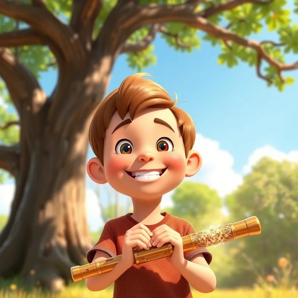 Milo was a cheerful boy who loved to play. One sunny day, he found an old flute under a big oak tree. The flute shimmered and sparkled like stars in the sky. Milo picked it up and blew gently, and a sweet melody filled the air. He felt a tingle of magic all around him!