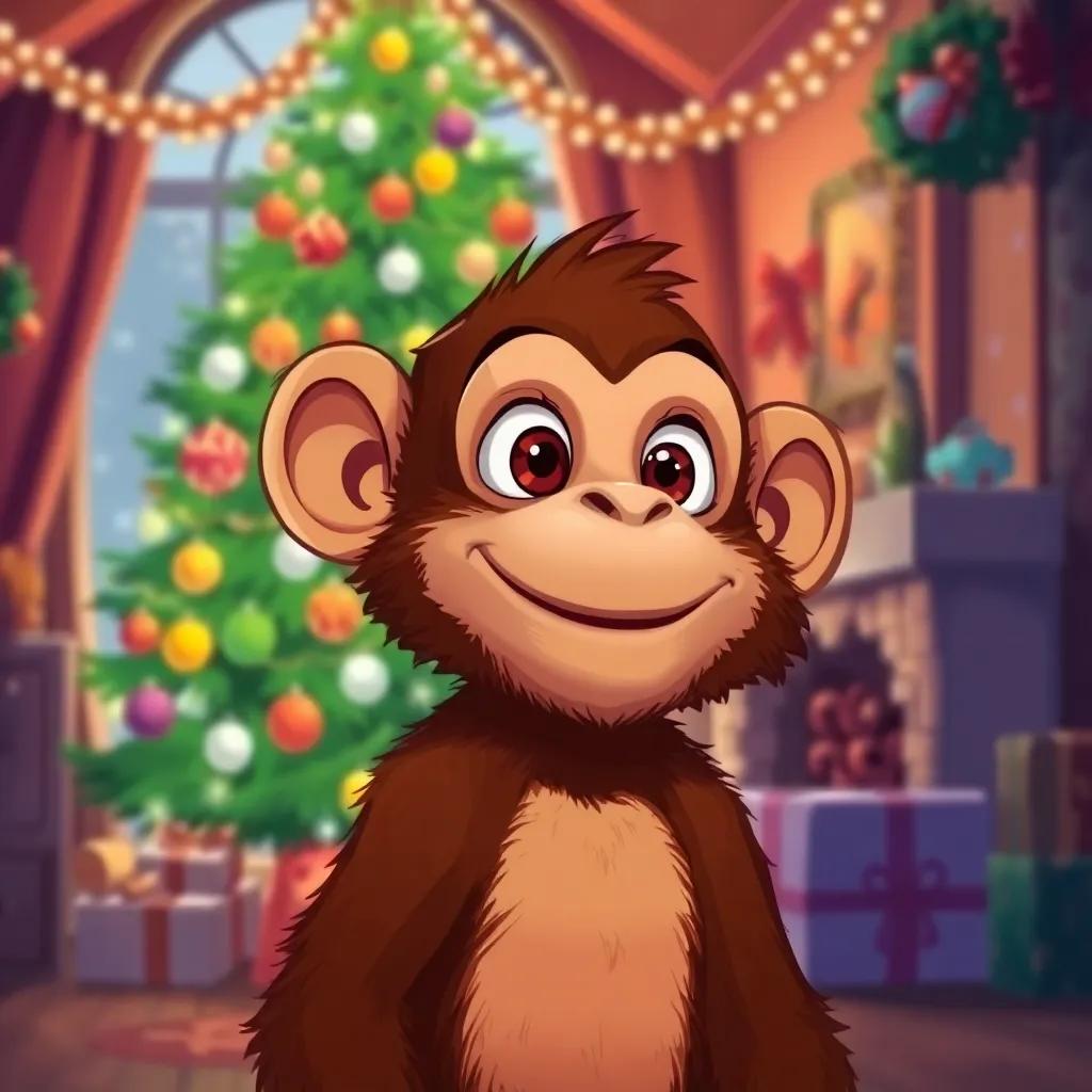 It was Christmas Eve, and Mylo the cheeky monkey was full of excitement. The house sparkled with lights, and the delicious smell of cookies filled the air. Mylo looked at the tall Christmas tree, its branches full of shiny ornaments and twinkling fairy lights. He had a mischievous idea—he would climb the tree to see the star on top!