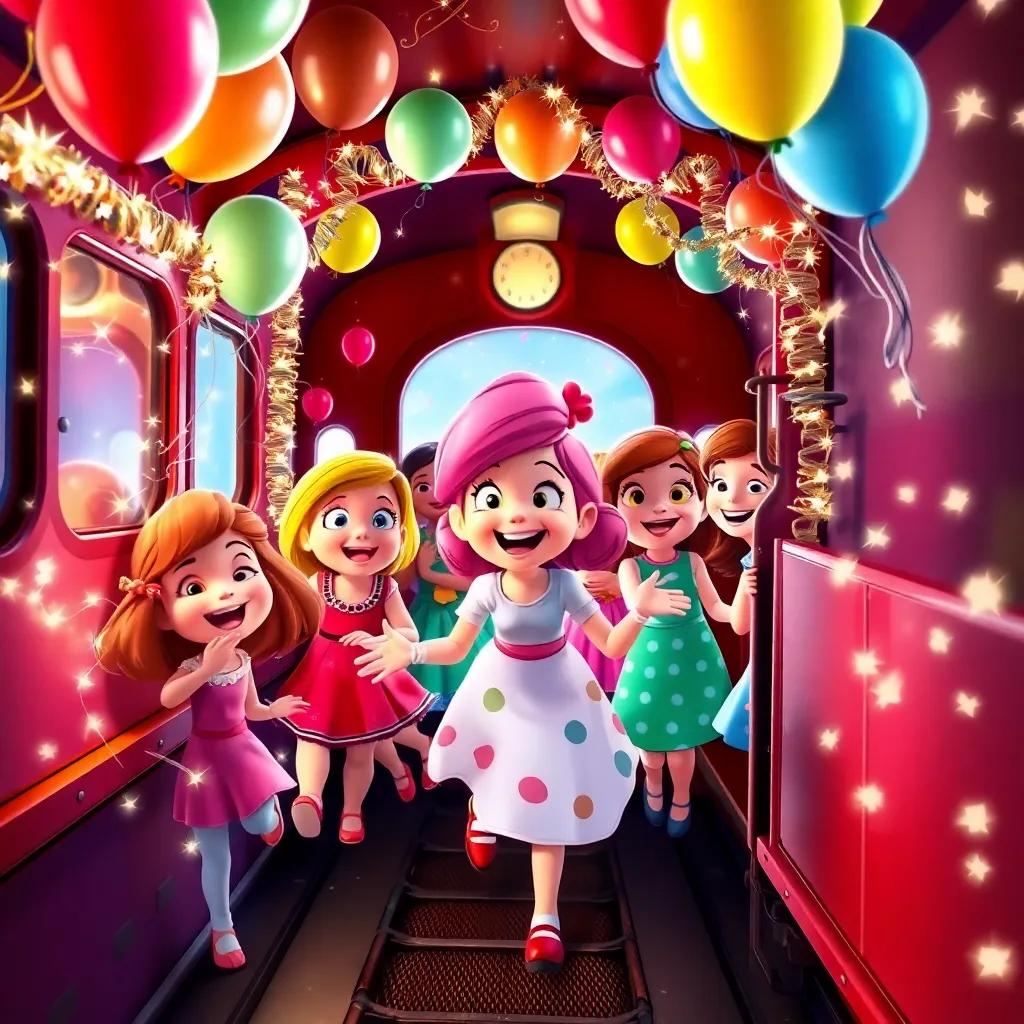 It was Amy's birthday, and she was very excited. Her friends arrived with big smiles and colorful gifts. Suddenly, a bright light shone outside. Amy ran to the window and saw a train with balloons!