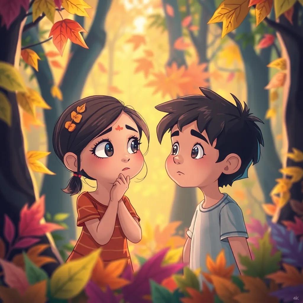 In the heart of a vibrant forest, two curious friends, Mia and Leo, sat under an ancient oak tree. 'Why do the leaves change colors?' asked Mia, eyeing the gold and crimson leaves. 'Because the world is always changing!' Leo replied, grinning widely. They both giggled, unaware of the lesson that nature was about to share with them.