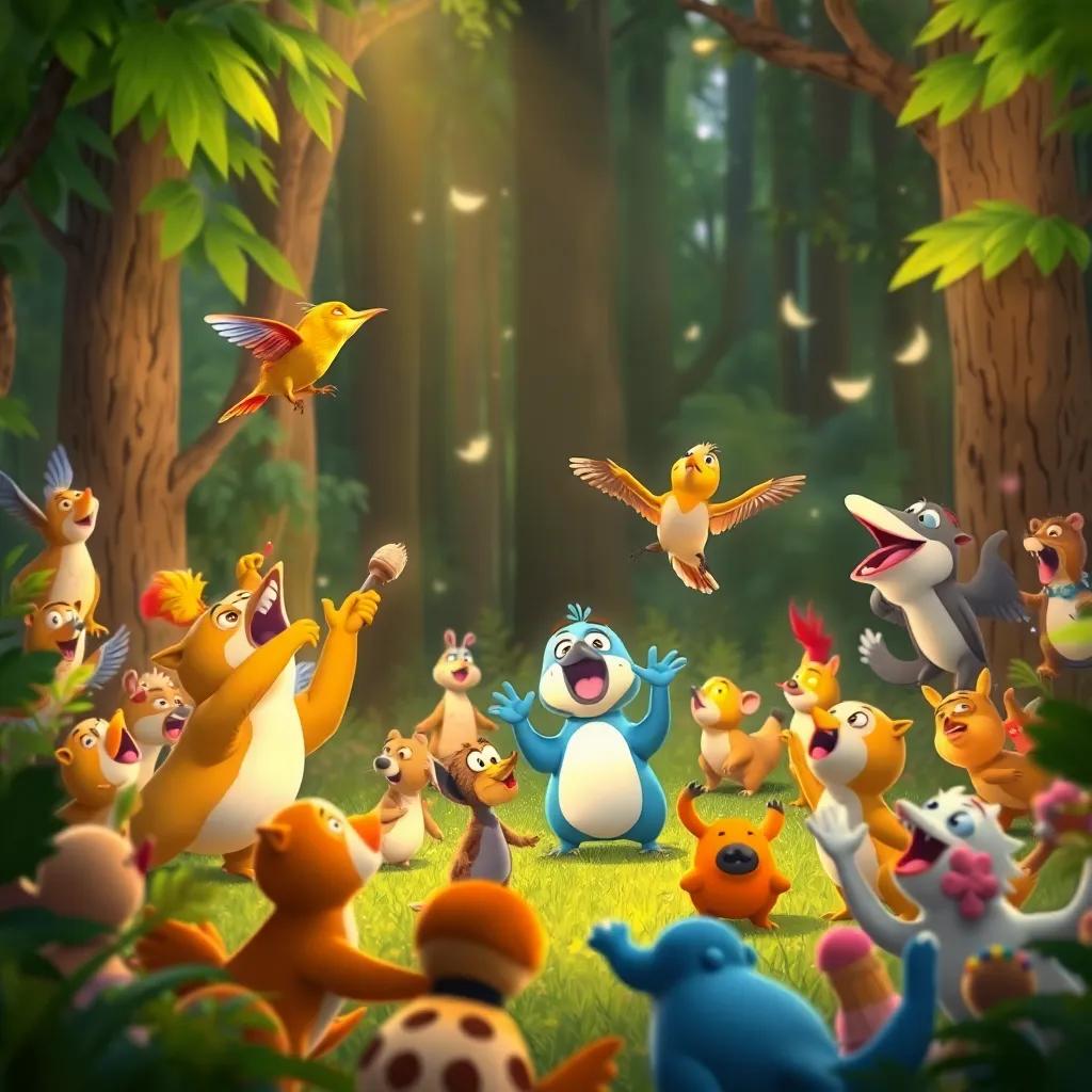 The birds sang their hearts out. Each note shimmered like rays of sunlight, and every animal began to dance. The forest echoed with laughter and joy, and from that day on, The Fantastic Feathered Friends became a symbol of happiness in their beloved home!