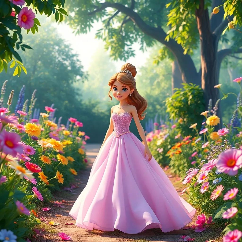 The princess, dressed in a lovely gown, walked through the colorful garden. She smiled brightly, amazed at the beauty surrounding her. Each flower was different, and she was delighted with all the efforts the flowers made to shine their best. She loved them dearly as they swayed in the soft wind.