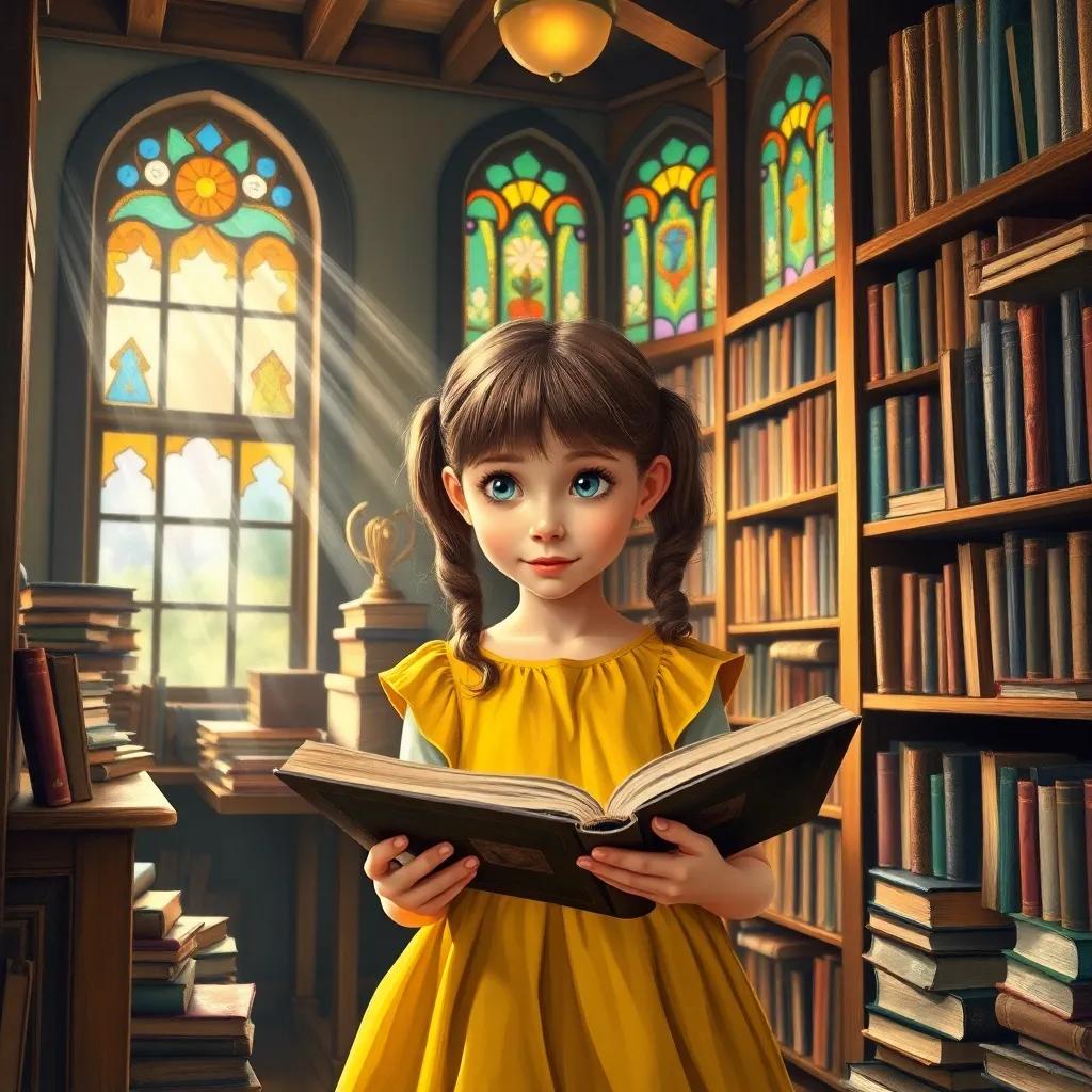 A cozy town library in Pageville with big old books on wooden shelves, sunlight streaming through colorful stained glass windows, a curious girl named Lucy, with brown hair in two ponytails, wearing a bright yellow dress, opening a dusty book, feeling amazed, warm atmosphere, vibrant colors