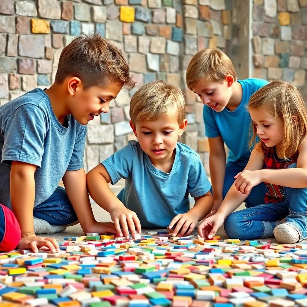 In a colorful town called Harmony, kids would gather to create amazing art. "Let’s make a giant mosaic!" shouted Mia, a bright girl with curly brown hair. Her friends cheered, "Yes, let’s do it!" And so, they all raced to find unique tiles from their homes. Some brought blue pieces, while others found red or yellow. Each tile was special, just like them.
