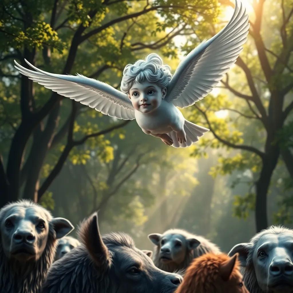 Oliver flying above the animals below, observing them with thoughtful eyes, trees in the background with sunlight filtering through, digital art, dynamic, nature-themed, high quality
