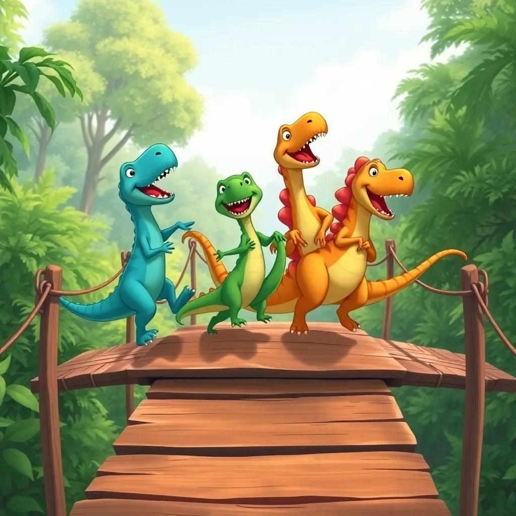 Suddenly, they came to a big, wobbly bridge. 'Are we brave enough to cross it?' asked Doodle, who loved to leap. 'Let’s see who can jump the farthest!' said Danny. Each dino took a turn, and they bounced across with silly twists and tumbles, holding each other’s tails for support, giggling all the way. They discovered that teamwork made everything more fun!