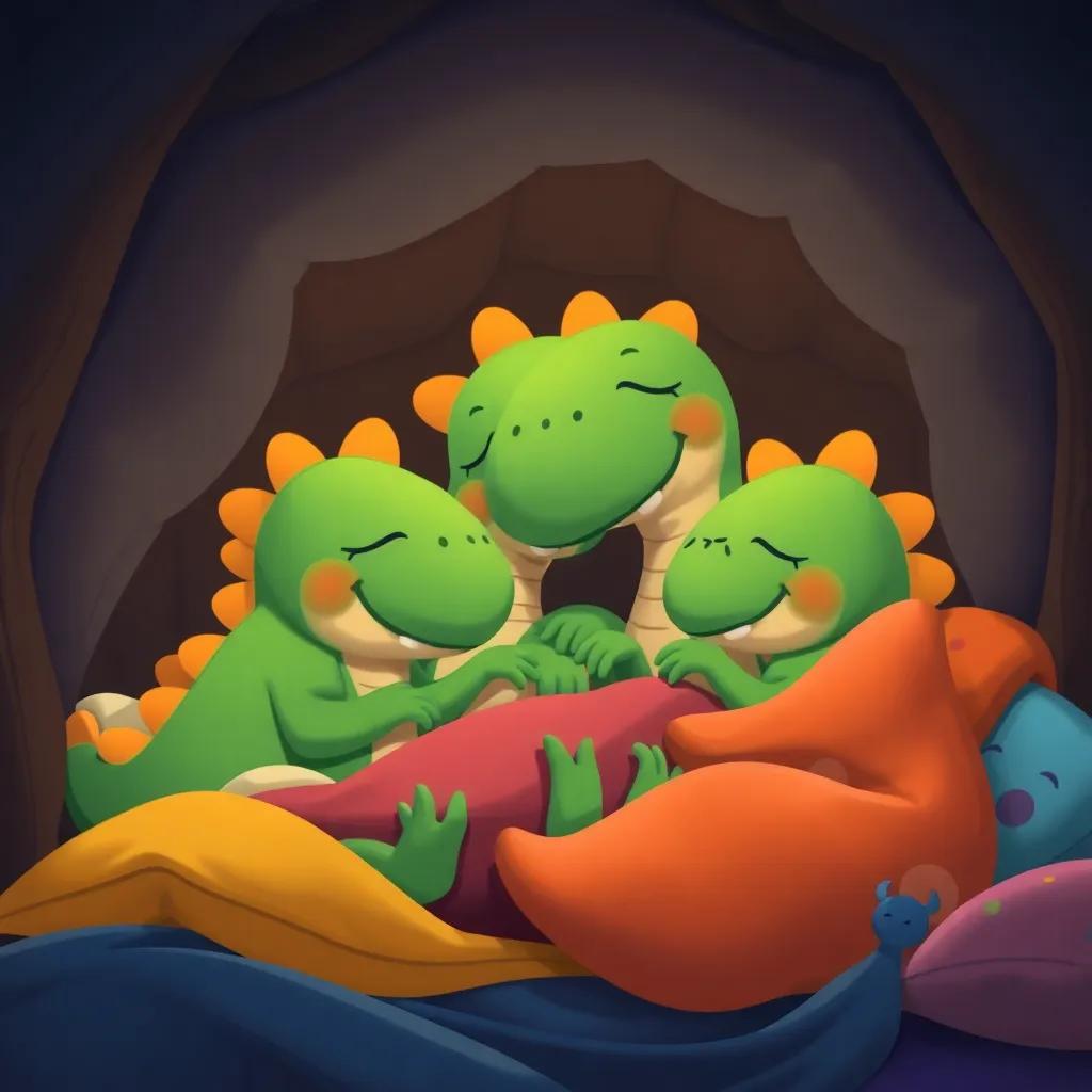 The Silly Dinosaur Family cuddled together in their cozy den, happily sleeping with smiles on their faces, surrounded by soft blankets and colorful cushions, peaceful and heartwarming night scene