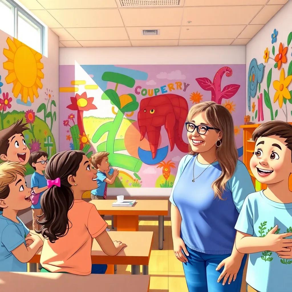 In a vibrant classroom, a curious student named Alex asked, "What makes a great artist, Ms. Lila?" Ms. Lila, a cheerful teacher with glasses and a bright smile, replied, "A great artist sees the world with wonder!" The room was filled with colorful drawings and art supplies, creating a lively atmosphere for creativity.