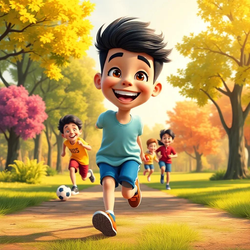 Fahd running happily in the park, playing sports with his friends, smiling and laughing, various trees and sunshine, vibrant digital art, warm colors, joyful