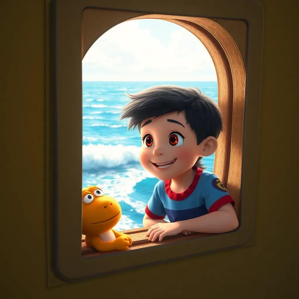 Tomás y Max decidieron explorar el faro. Subieron por la escalera de caracol que crujía al caminar. Al llegar a la cima, miraron por la ventana. Desde allí, podían ver todo el océano azul y las olas que rompían en la orilla.