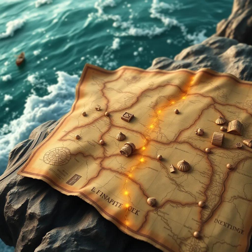 Un antiguo mapa sobre un cofre, con mar y viento en el fondo, detalles de tesoros brillantes y un camino marcado con tinta, escenario de aventura, arte digital, colores cálidos, visual encantadora