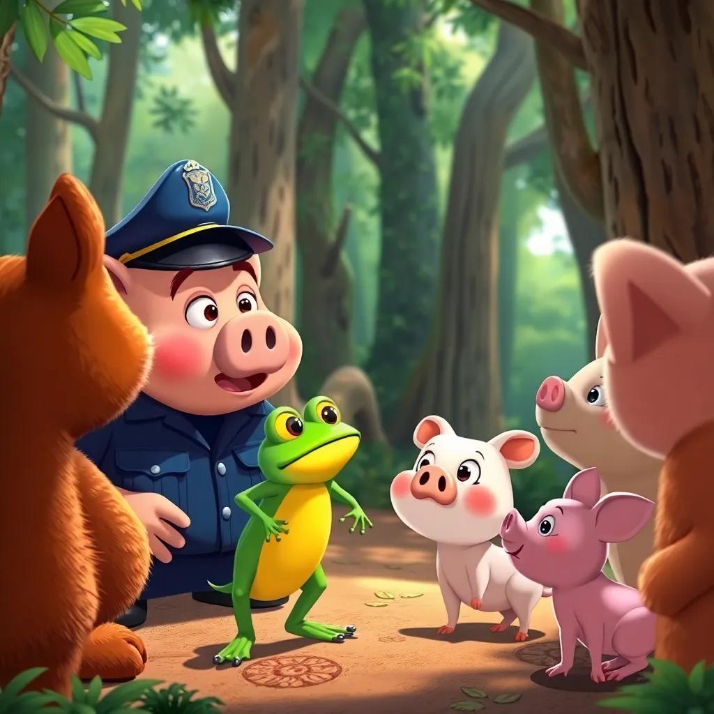 El Gato dijo, “¡Un momento! Yo vi algo sospechoso esta mañana. Vi al perro caminar rápidamente por el bosque, con una cesta que parecía pesada.” El Perro tembló, “¡No, no! Yo no robé nada. Solo buscaba hierbas para mi sopa.” El Cerdito menor pensó un momento y dijo, “Hmmm… Yo vi al perro cerca del lugar del robo, pero eso no significa que sea él. Todos somos amigos, ¿verdad?” Lo acordaron y el Policía dijo, “Estamos aquí para buscar pistas.”