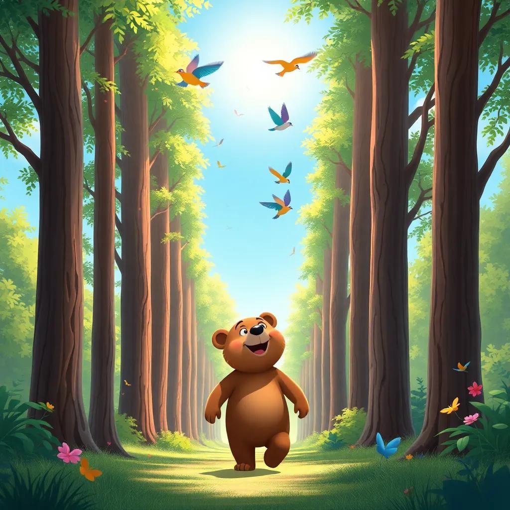 Tito the bear walking happily between tall trees, listening to birds singing, with a bright blue sky above and sunlight filtering through the leaves, illustration, colorful, joyful, child-friendly