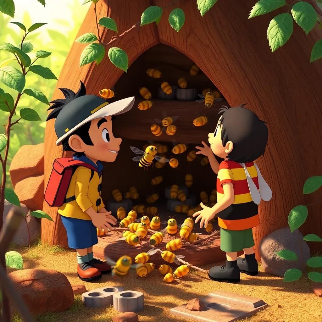 Juntos, Tito y Bruno se acercaron al panal. Tito llamó a las abejas con dulces palabras. Las abejas se calmaron, y Bruno movió las ramas. ¡Lograron obtener miel!