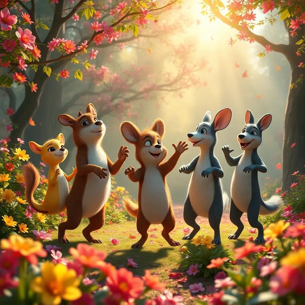 A medida que la tarde avanzaba, un viento suave sopló trayendo consigo el aroma de las flores. Los animales sintieron la primavera acercándose y decidieron bailar. Saltaron y giraron, disfrutando del calor del sol y de la compañía. Cada uno mostró sus mejores pasos, ¡qué fiesta tan maravillosa!