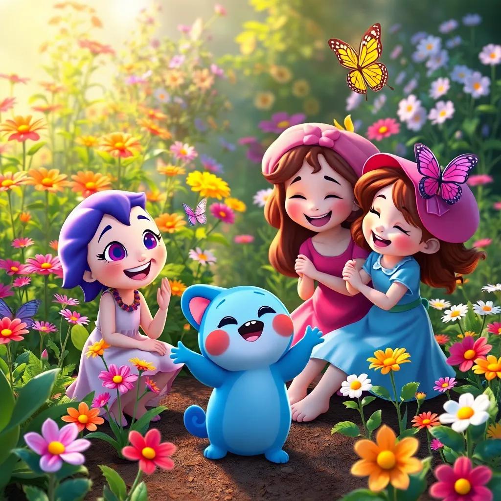 Luna, Toby, and Rosa playing together in the garden, full of laughter and fun, surrounded by colorful flowers and butterflies, joyful atmosphere, high quality