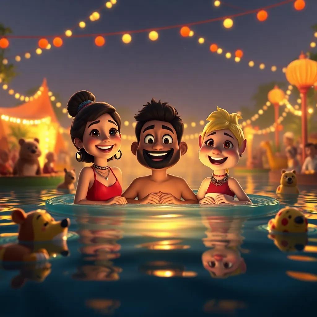 Rita, Pablo, and Lila showing colorful lights, laughing joyfully while preparing for the festival by the lake, night setting with soft glowing lights, warm and inviting colors, detailed digital art, celebration feel, high quality