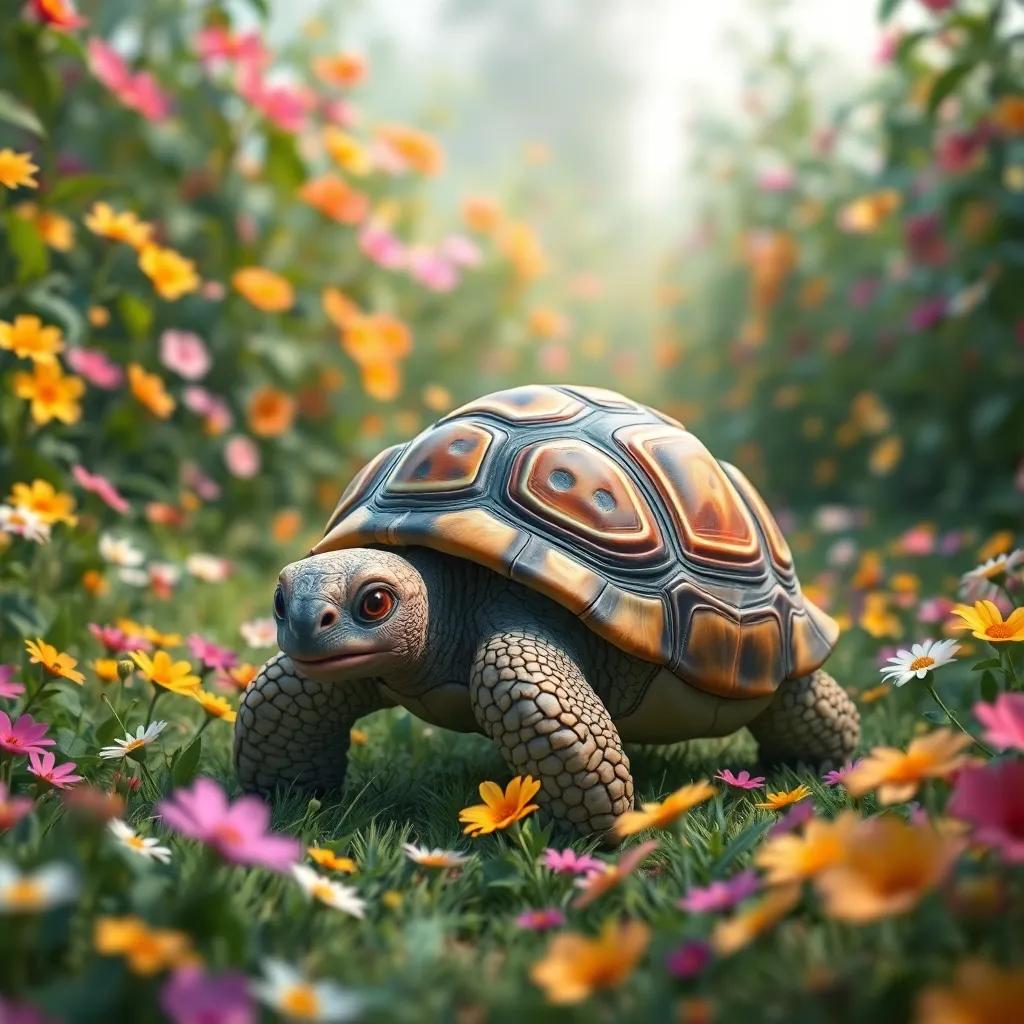 A gentle, wise tortoise named Tula slowly walking in a lush green forest, colorful flowers all around, digital art, serene atmosphere, vibrant colors, soft focus, high quality