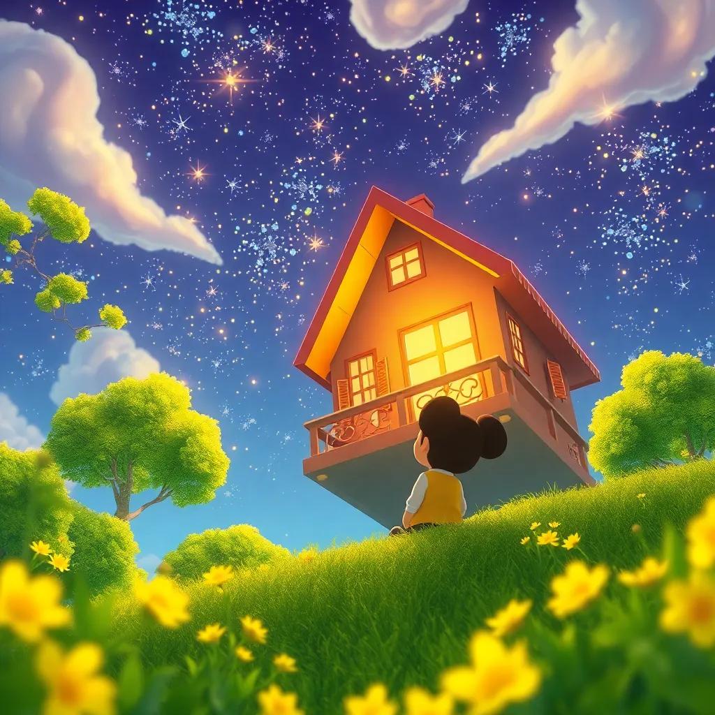 Mico mirando su hogar desde el cielo, un claro lleno de flores y árboles verdes, su hogar se siente acogedor y brillante, arte imaginativo, luminoso, perspectiva desde arriba, colorido, ilustración
