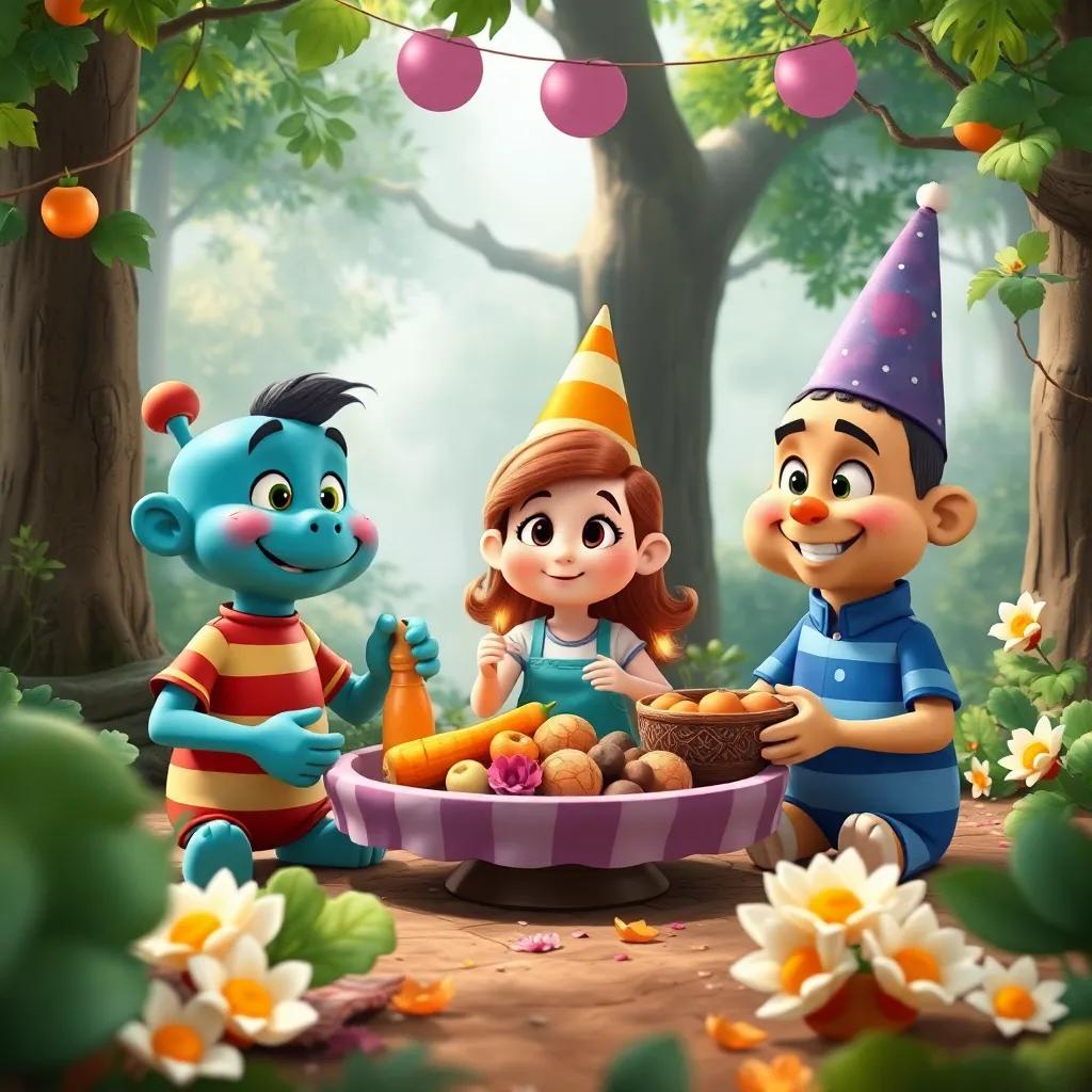 Juntos, idearon un plan. Cada animal traería algo especial. Sammy trajo zanahorias frescas, Lola llevó nueces, y Tito se sumergió en el agua para recoger flores de loto. El bosque se llenó de risas y alegría mientras preparaban la celebración.
