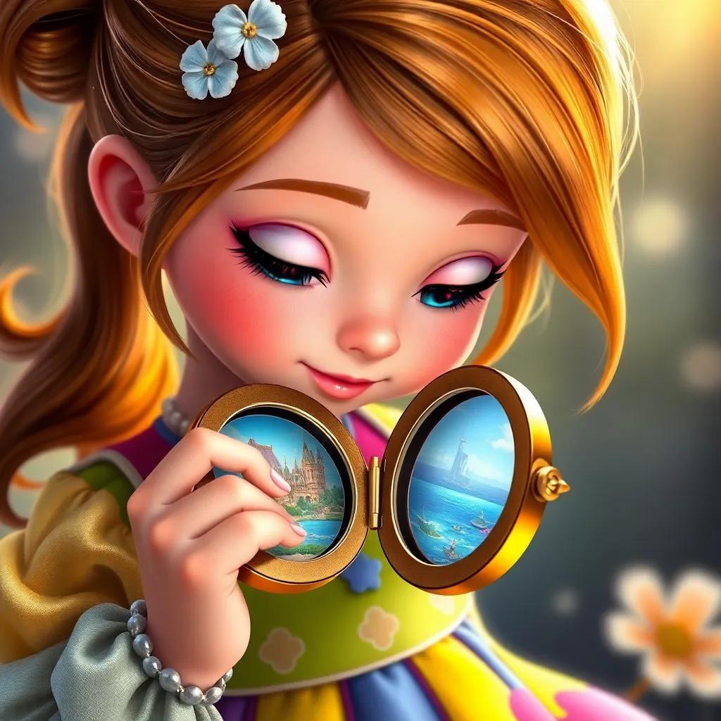 Daisy, a young girl with bright brown hair in a ponytail, wearing a colorful dress, opening a shiny locket with tiny pictures of castles and oceans inside, close-up view, magical aura, imaginative style, high quality