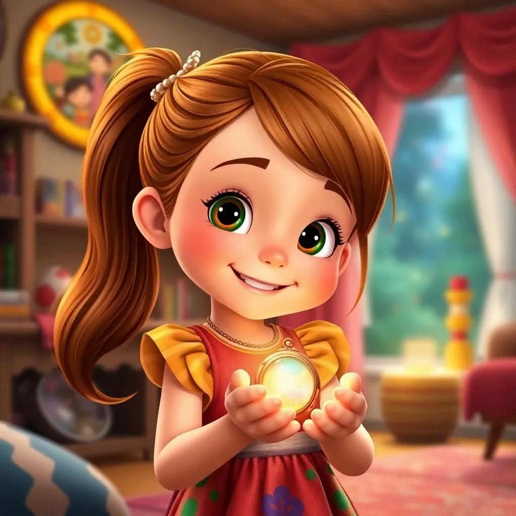 Daisy, a young girl with bright brown hair in a ponytail, wearing a colorful dress, with the magical locket glowing in her hand, looking excited and ready for her next adventure at home, vibrant and bright colors, high quality