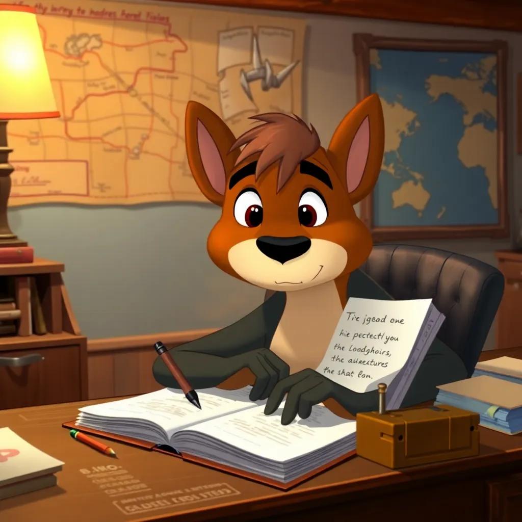 Tiro at his desk, writing in the 'Logbook' about his adventures, a map of the sea on the wall behind him, thoughtful expression, cozy setting, warm colors, detailed illustration